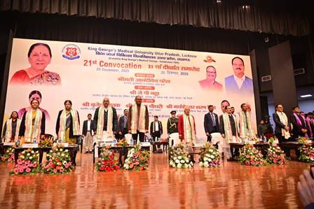 केंद्रीय स्वास्थ्य मंत्री श्री जगत प्रकाश नड्डा ने आज लखनऊ में किंग जॉर्ज मेडिकल यूनिवर्सिटी (केजीएमयू) के 21 वें वार्षिक दीक्षांत समारोह को संबोधित किया। इस अवसर पर उत्तर प्रदेश की राज्यपाल श्रीमती आनंदीबेन पटेल, उप मुख्यमंत्री एवं चिकित्सा शिक्षा, चिकित्सा, स्वास्थ्य एवं परिवार कल्याण मंत्री श्री ब्रजेश पाठक, केन्द्रीय वित्त राज्य मंत्री श्री पंकज कुमार, स्वास्थ्य एवं परिवार कल्याण राज्य मंत्री श्री मयंकेश्वर शरण सिंह और केन्द्र सरकार के प्रधान वैज्ञानिक सलाहकार प्रोफेसर अजय कुमार सूद भी उपस्थित थे।