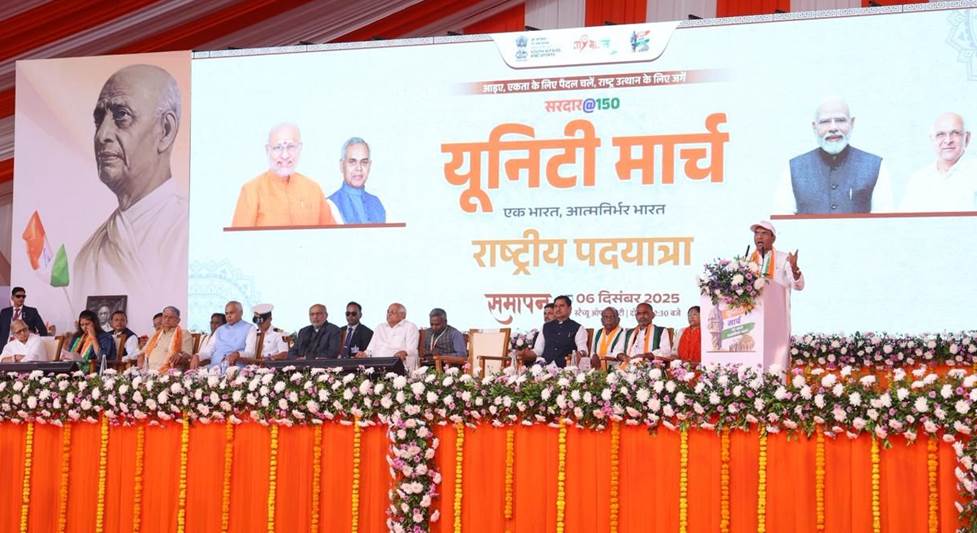 भारत के लौह पुरुष सरदार वल्लभ भाई पटेल को समर्पित एक ‘समर्पित श्रद्धांजलि स्वरूप’ 26 नवंबर 2025 को करमसद से शुरू हुआ ऐतिहासिक सरदार@150 यूनिटी मार्च आज गुजरात के केवड़िया स्थित स्टैच्यू ऑफ यूनिटी पर एक भव्य समारोह में संपन्न हुआ। यह हाल के समय के सबसे बड़े जन-नेतृत्व वाले आंदोलनों में से एक बन गया। केंद्रीय युवा कार्यक्रम एवं खेल तथा श्रम एवं रोजगार मंत्री डॉ. मनसुख मांडविया और केंद्रीय युवा कार्यक्रम एवं खेल राज्य मंत्री श्रीमती रक्षा खडसे आज पदयात्रा के अंतिम चरण में शामिल हुए और गरुड़ेश्वर दत्त मंदिर से स्टैच्यू ऑफ यूनिटी तक प्रतिभागियों के साथ पैदल चले। इससे इस ऐतिहासिक पदयात्रा के समापन दिवस को अपार प्रेरणा और गति मिली।