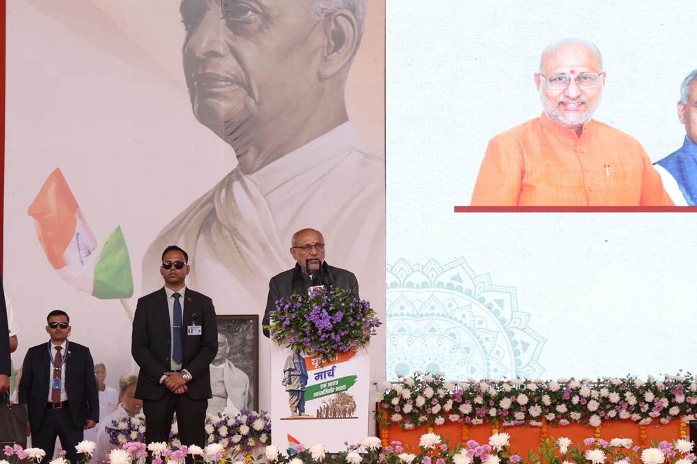 उपराष्ट्रपति श्री सी.पी. राधाकृष्णन ने सरदार@150 एकता मार्च के समापन को “भारत की एकता, कर्तव्य और राष्ट्र निर्माण की चिरस्थायी भावना का उत्सव” बताया। उन्होंने कहा कि देश भर के पदयात्रियों की भागीदारी यह सिद्ध करती है कि सरदार वल्लभभाई पटेल द्वारा प्रज्वलित एकता की ज्योति आज भी प्रज्वलित है और सदैव प्रज्वलित रहेगी। सरदार पटेल को अखंड भारत के निर्माण के लिए 560 से अधिक रियासतों का एकीकरण करने वाले वास्तुकार बताते हुए उन्होंने कहा कि राष्ट्र उनका सदैव ऋणी रहेगा। उन्होंने इस बात पर बल दिया कि भारत सदैव सरदार पटेल का कृतज्ञ रहेगा जिनके नेतृत्व ने एक विखंडित भूमि का एकीकरण किया और एक सच्चे अखंड राष्ट्र की नींव रखी। उपराष्ट्रपति ने कहा कि प्रधानमंत्री श्री नरेन्द्र मोदी के दूरदर्शी नेतृत्व में सरदार पटेल का एक मजबूत और आत्मनिर्भर भारत का सपना तेजी से साकार हो रहा है जिनके सुधार और युवा-केंद्रित पहल देश को विकसित भारत 2047 की ओर अग्रसर कर रहे हैं। उन्होंने युवाओं से एकता, अनुशासन और राष्ट्रीय भावना के साथ राष्ट्र निर्माण में प्रतिदिन योगदान देने का आग्रह किया। श्री राधाकृष्णन ने कहा कि यह पदयात्रा एक आत्मविश्वास से भरे नए भारत के सामूहिक संकल्प को दर्शाती है। अपने भाषण के समापन पर उन्होंने कहा कि भारत की सबसे बड़ी ताकत उसकी एकता है और “भारत एक था, एक है और हमेशा एक रहेगा।”