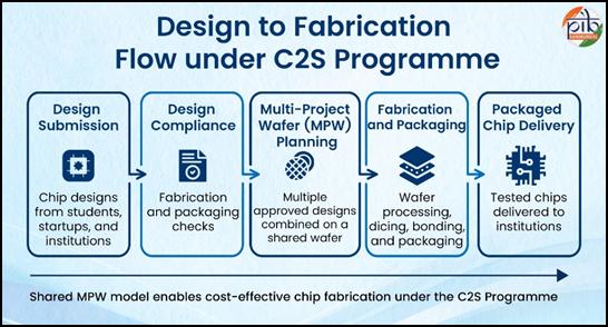 चिप्स टू स्टार्ट-अप (सी2एस) कार्यक्रम के तहत भारत के चिप डिज़ाइन इकोसिस्टम को एक समन्वित संस्थागत ढाँचे के माध्यम से मजबूत किया जा रहा है, जो तकनीकी अवसंरचना समर्थन और बड़े पैमाने पर क्षमता निर्माण को जोड़ता है। सी-डैक और चिपइन सेंटर जैसे प्रमुख कार्यक्रम और संस्थान चिप डिज़ाइन शिक्षा और नवाचार के लिए प्रारंभ से अंत तक सहायता प्रदान करते हैं। अनुसंधान एवं विकास संस्थानों और उद्योग भागीदारों को एकीकृत करके, सी2एस का संस्थागत ढाँचा स्वदेशी चिप डिज़ाइन में सहायता करता है तथा आत्मनिर्भर और वैश्विक रूप से प्रतिस्पर्धी सेमीकंडक्टर डिज़ाइन इकोसिस्टम के भारत के उद्देश्य को आगे बढ़ाता है।