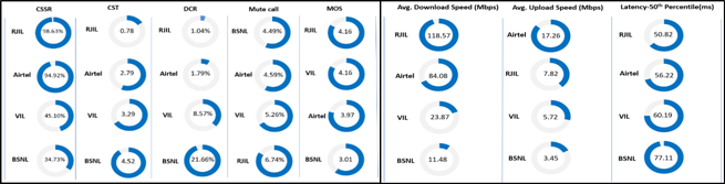 कॉल सेटअप सफलता दर – ऑटो-सिलेक्शन मोड (5जी/4जी/3जी/2जी) में एयरटेल, बीएसएनएल, आरजेआईएल और वीआईएल की कॉल सेटअप सफलता दर क्रमशः 94.92%, 34.73%, 98.63% और 45.10% है।