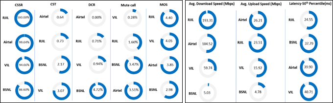 कॉल सेटअप सफलता दर – एयरटेल, बीएसएनएल, आरजेआईएल और वीआईएल की ऑटो-सिलेक्शन मोड (5जी/4जी/3जी/2जी) में कॉल सेटअप सफलता दर क्रमशः 99.64 प्रतिशत, 86.60 प्रतिशत, 100.00 प्रतिशत और 94.66 प्रतिशत है।