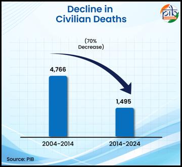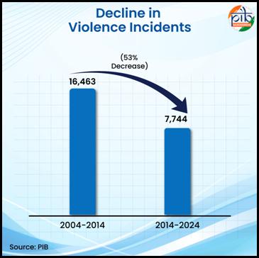 - 2004-2014 से 2014-2024 की अवधि में हिंसक घटनाओं में 53% की कमी आई (16,463 से घटकर 7,744)