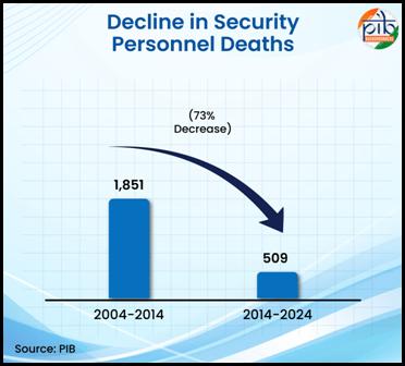 2. सुरक्षा बलों की मृत्यु में 73% की कमी आई (1,851 से घटकर 509)