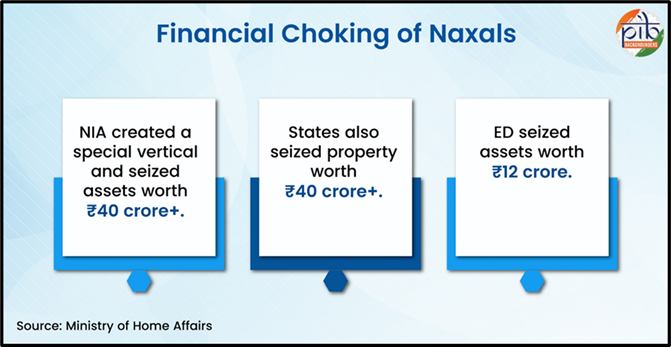 केंद्र सरकार ने एनआईए में एक समर्पित विभाग बनाकर नक्सलियों के वित्तपोषण पर प्रभावी ढंग से लगाम लगा दी है। इस विभाग ने 40 करोड़ रुपये से अधिक की संपत्ति जब्त की है, जबकि राज्यों ने भी 40 करोड़ रुपये से अधिक की संपत्ति जब्त की है और प्रवर्तन निदेशालय ने 12 करोड़ रुपये कुर्क किए हैं। इस एक साथ की गई कार्रवाई से शहरी नक्सलियों को गंभीर नैतिक और मनोवैज्ञानिक क्षति पहुंची है और उनके सूचना युद्ध नेटवर्क पर नियंत्रण और भी कड़ा हो गया है।