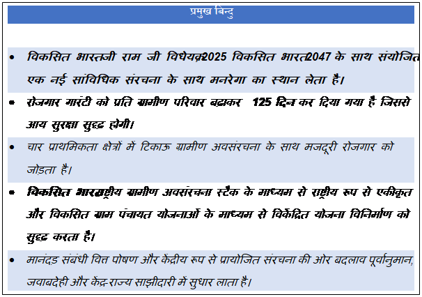 इस पृष्ठभूमि में, भारत के राष्ट्रपति द्वारा विकसित भारत–गारंटी फॉर रोज़गार एंड आजीविका मिशन (ग्रामीण) विधेयक, 2025 को स्वीकृति प्रदान की गई है। यह कानून मनरेगा में व्यापक वैधानिक बदलाव का प्रतिनिधित्व करता है, जो ग्रामीण रोज़गार को विकसित भारत 2047 के दीर्घकालिक विजन के साथ संयोजित करता है तथा जवाबदेही, बुनियादी ढांचे के परिणामों और आय सुरक्षा को सुदृढ़ करता है।