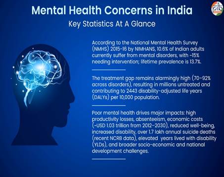 Mental health is the state of well-being in which a person can cope with normal stresses of life. It allows one to learn, work well and contribute to community. Good mental health includes emotional, psychological, and social well-being. Poor mental health can lead to disorders like anxiety, depression, and other severe disorders, with far-reaching consequences for physical health, relationships, and overall functioning. In India, rising stress levels, rapid urbanisation, and post-pandemic challenges have increased the demand for mental health care. Timely access to support and treatment helps prevent crises and improves quality of life. Recognising this, the government increasingly views mental health as central to inclusive development, social stability and productivity.