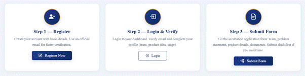 How to Apply: Interested applicants can complete the incubation application through a simple three-step process. First, register on the portal using basic details and an official email ID for faster verification. Next, log in to the dashboard, verify your email, and complete your profile by providing details about your team, product idea, and stage of development. Finally, fill in the incubation application form with information on the problem statement, proposed solution, and required documents. Applicants may save and submit a draft before final submission.