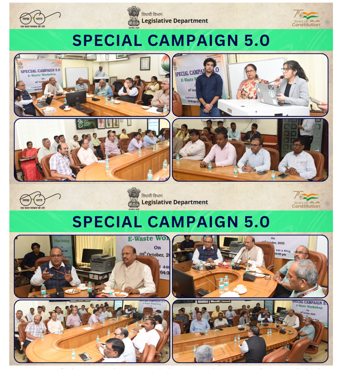 As part of the ongoing Special Campaign 5.0, the Legislative Department, Ministry of Law and Justice, organized a workshop on e-waste management at Conference Room, Shastri Bhawan on 9th October, 2025.The event was graced by Dr. Rajiv Mani, Secretary, along with Dr. Manoj Kumar, Additional Secretary, Shri R.K Pattanayak, Additional Secretary/Nodal Officer, Dr. K.V Kumar, Additional Secretary and other officers and staff of the Legislative Department including O.L Wing and VSP.  The event aimed to raise awareness among officials about the importance of responsible e-waste disposal.   The workshop, is an attempt to sensitise the participants to the dangers posed by negligence in dealing with electronic waste, its environmental and health hazards, and the appropriate methods of e-waste segregation, recycling and disposal as per the E-Waste guidelines. Experts on the subject provided insights into best practices and the recourse to digital decluttering methods, that can be adopted at workplace.
