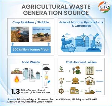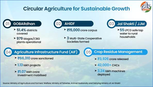 The government is implementing various policies to promote circularity in agriculture and allied sectors by converting waste into valuable resources. Initiatives such as Galvanising Organic Bio-Agro Resources Dhan (GOBARdhan) and Crop Residue Management are transforming agricultural, animal, and food waste into organic manure.