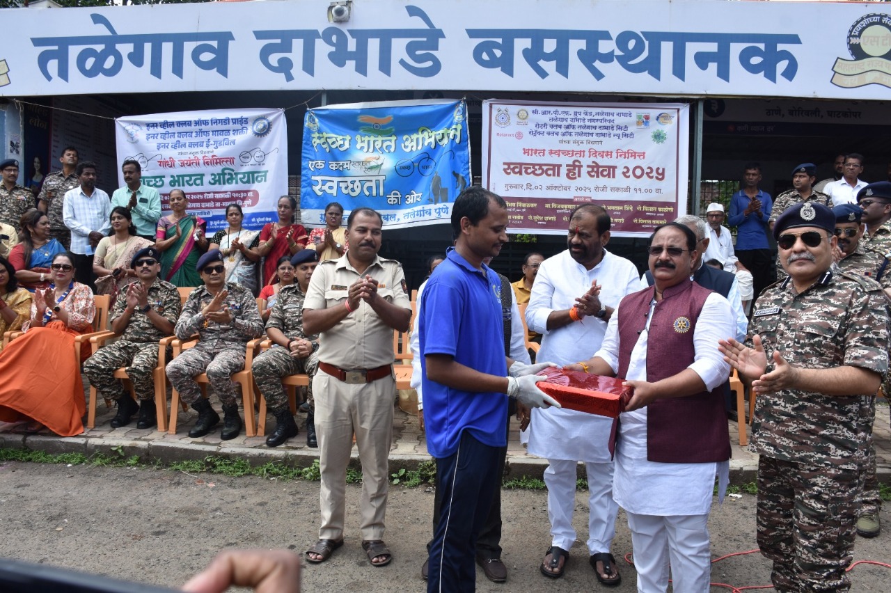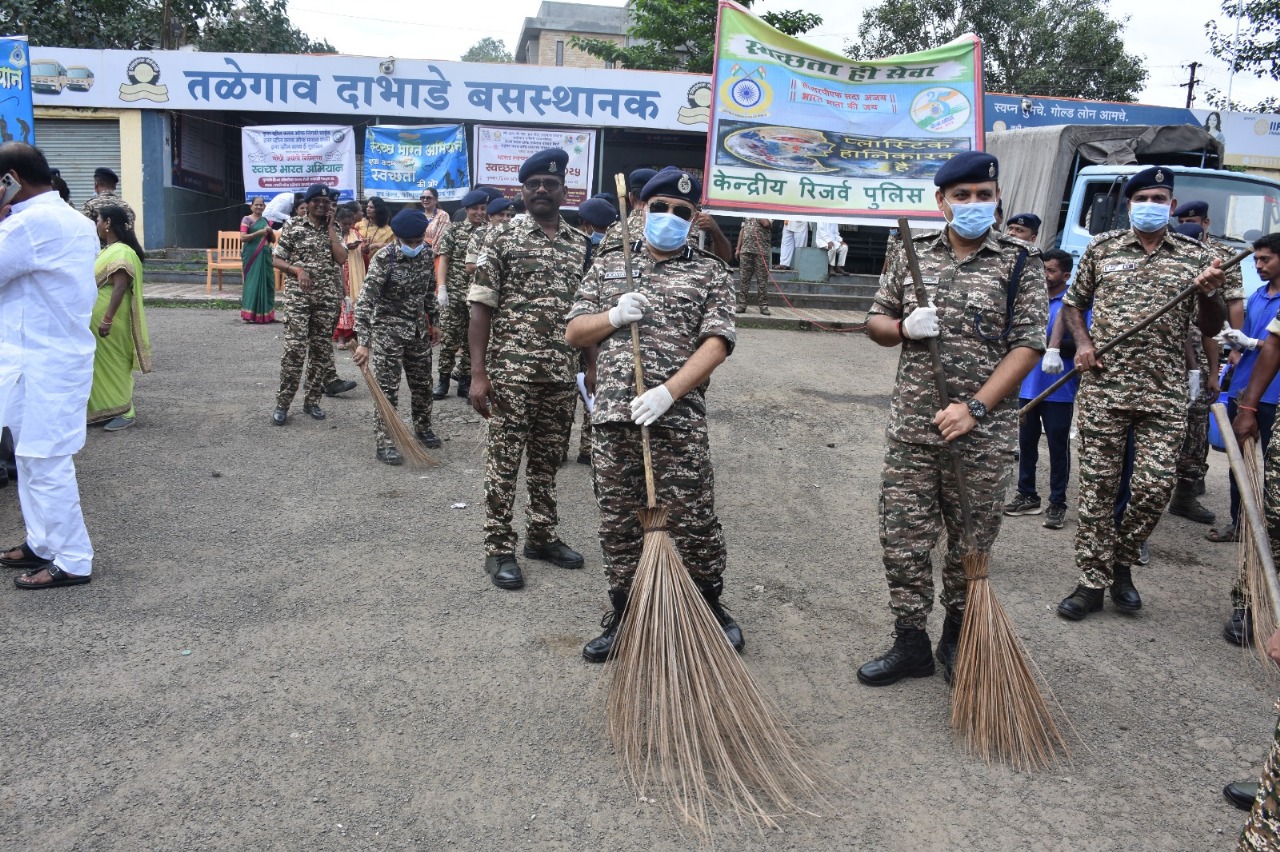 A Swachhata Abhiyan was organised at Talegaon Bus Stand and Talegaon Railway Station, where officers and personnel of Group Centre, CRPF Pune, led by Shri K.K. Chand, Commandant, actively participated. The campaign also saw the participation of representatives of the local council, officials and volunteers of Rotary Club, Talegaon Dabhade, and members of Inner Wheel Club, Nigdi Pride, who joined hands with CRPF to clean the area.