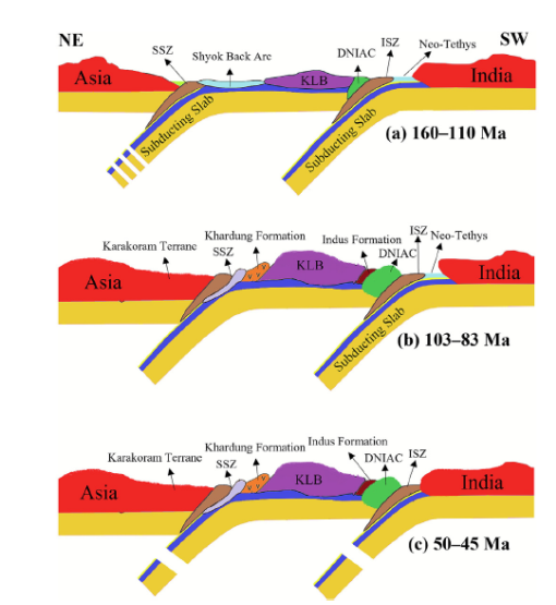 Fig: A 2-D geodynamic model for the evolution of the DNIAC-KLB compiled and modified after Ahmad et al. (2008). Abbreviations: KLB, Kohistan Ladakh Batholith; DNIAC, Dras Nidar Island Arc Complex; SSZ, Shyok Suture Zone; ISZ, Indus Suture Zone.