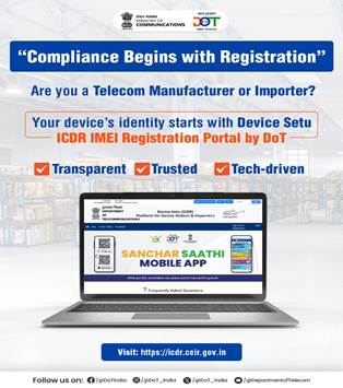 a. Manufacturers shall register the IMEI number of every device like mobile handset, module, modem, SIM Box etc. bearing IMEI manufactured in India with the Government prior to first sale, testing, research & development (R&D) or any other purpose on Device Setu (Indian Counterfeited Device Restriction (ICDR)) portal at https://icdr.ceir.gov.in