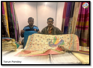 A few rows away, 49-year-old Tarun Pandey from Nalanda adjusts soft Baavanbuti. sarees woven with fine motifs. This marks his eighth participation at IITF. As a traditional weaving artisan, he represents a generational weaving tradition practiced across numerous Bihar villages. Each saree reflects meticulous labour, taking nearly three and a half days to complete, making his work both time-intensive and culturally significant.