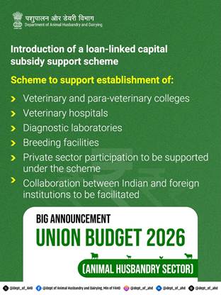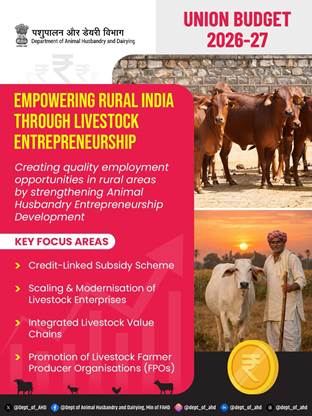 The Union Budget 2026-27 proposes a credit-linked subsidy scheme aimed at boosting entrepreneurship and modernization in animal husbandry — benefiting livestock, dairy, and poultry enterprises. This measure is intended to help farmers adopt modern equipment, improve productivity, and create value chains across rural sectors.