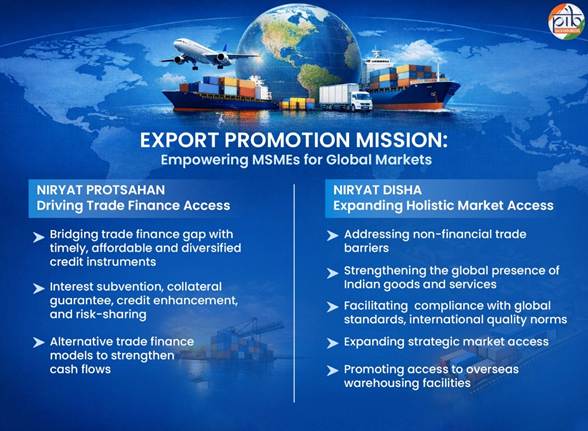 India’s export ecosystem is being strengthened through a mission-mode approach under the Export Promotion Mission (EPM), aimed at expanding global market access and enhancing the competitiveness of Indian exporters, particularly Micro, Small and Medium Enterprises (MSMEs).