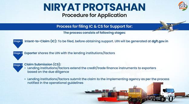 For Niryat Protsahan interventions, exporters file an Intent-to-Claim (IC) on dgft.gov.in prior to obtaining support, upon which a Unique Identification Number (UIN) is generated. The exporter shares the UIN with the lending institution or factoring entity. Lending institutions extend the credit or trade finance instruments to exporters and submit the Claim Submission (CS) to the implementing agency as per notified guidelines.