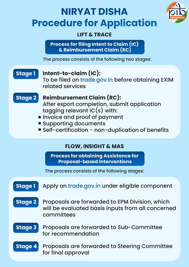 For LIFT and TRACE, exporters file an Intent-to-Claim (IC) on trade.gov.in before obtaining EXIM-related services and submit a Reimbursement Claim (RC) after export completion with supporting documents and self-certification.