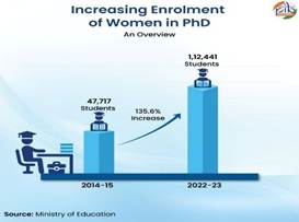 Female Ph.D. enrolment has more than doubled, with a remarkable 135.6% increase (from 2014-2015 to 2022-2023), adding 64,724 more women researchers. This highlights strong progress of women in advanced academic participation.