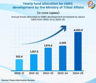 The expansion of EMRSs directly benefits local tribal communities by providing free, high-quality, CBSE-affiliated education to children within or near their own environment. With well-equipped hostels, classrooms, laboratories, and sports facilities, EMRSs ensure holistic development, including academic, physical, and extracurricular growth of tribal students. In addition, students receive free boarding, nutritious meals, healthcare, and career guidance, contributing to their overall well-being and readiness for higher education and competitive careers. Collectively, these measures enhance educational attainment, promote social inclusion, and empower tribal communities economically and socially.