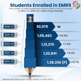 Established by the Ministry of Tribal Affairs, Eklavya Model Residential Schools (EMRS) impart quality education to Scheduled Tribe (ST) students, enabling them to access opportunities in higher and professional education and secure employment in various sectors.