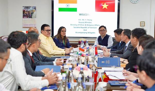 H.E. Mr. Y. Thong, Deputy Minister, Ministry of Ethnic & Religious Affairs, Vietnam, accompanied by a delegation, today called on Dr. Chandra Shekhar Kumar, Secretary, Ministry of Minority Affairs, during his visit to India. The meeting reflected on the long-standing historical and civilisational ties between India and Vietnam, including their shared Buddhist heritage and strong people-to-people connections. Both sides also noted the significance of the 10th year of the India–Vietnam Comprehensive Strategic Partnership and discussed ways to further deepen bilateral cooperation.