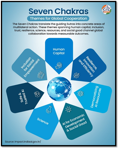 Building on the three foundational Sutras, the deliberations at the AI Impact Summit is structured around 7 Chakras. These Chakras represent key areas of multilateral cooperation that channel collective efforts towards inclusive and sustainable societal outcomes. 11