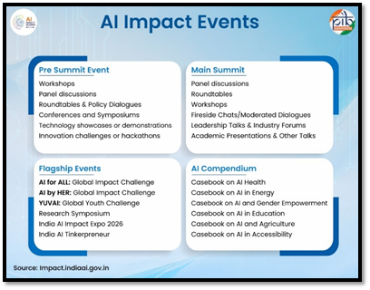 The objectives of the India–AI Impact Summit 2026 are operationalised by the AI Impact Events. The events provide structured platforms to present Indian AI initiatives, sectoral use cases, and institutional frameworks, while enabling feedback, peer learning, and international benchmarking.