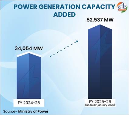 As India’s economy grows and living standards rise, electricity demand continues to expand across households, industry, agriculture, and services. Meeting this demand at scale requires not only more power generation but a system capable of delivering it across vast geographies. Focusing on building this scale, the generation capacity has expanded steadily across conventional and renewable sources. During the financial year 2025–26 (up to 31 January 2026), a record 52,537 MW of generation capacity from all sources has been added. Of this, 39,657 MW comes from renewable energy, including 34,955 MW of solar power and 4,613 MW of wind power. This represents the highest ever capacity addition in a single year, surpassing the previous record of 34,054 MW achieved in FY 2024–25.