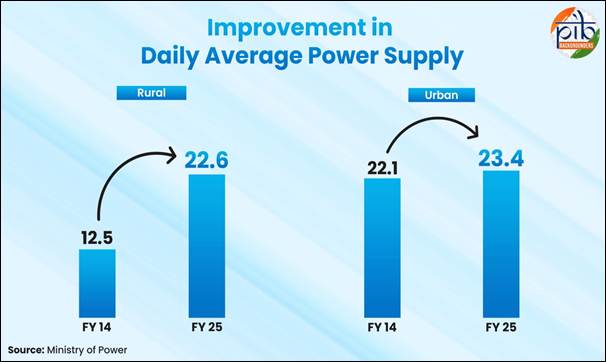 Collectively, these initiatives involved investments of approximately ₹1.85 lakh crore. Over 18,374 villages were electrified, and around 2.86 crore households received electricity connections during the Saubhagya period from October 2017 to March 2022. Daily average power supply has improved significantly across both rural and urban areas over the past decade. In rural India, average daily supply increased from 12.5 hours in FY14 to 22.6 hours in FY25, reflecting substantial gains in reliability and access. Urban areas also saw improvement, with daily average supply rising from 22.1 hours to 23.4 hours over the same period. Per capita electricity consumption in India has also risen to 1,460 kilowatt-hours in 2024–25, registering an increase of 503 kilowatt-hours (about 52.6%) compared to 957 kilowatt-hours in 2013–14.