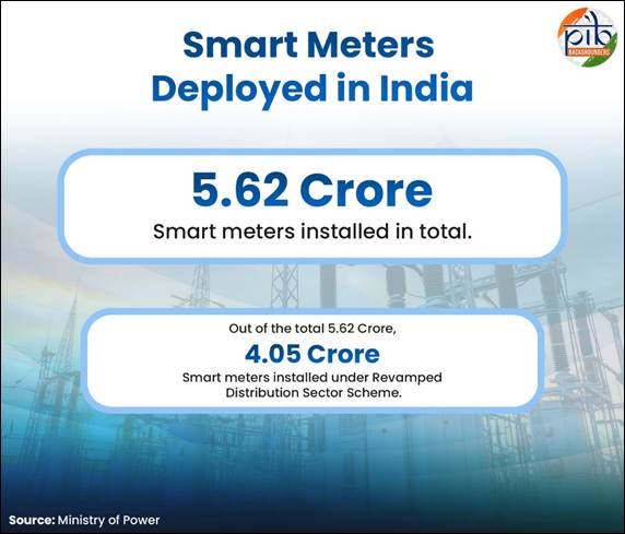 A key component of the scheme is the rollout of smart metering for consumers, distribution transformers, and feeders. Smart meters give consumers near real-time visibility of their electricity usage through mobile applications. These apps allow users to monitor consumption, manage budgets, recharge conveniently, receive low-balance alerts, and access historical usage data to optimise consumption. As of 15th January 2026, 4.05 crore smart meters have been installed under RDSS. In addition, States have installed smart meters under their own plans and other schemes. In total, 5.62 crore smart meters have been installed across the country under various initiatives.