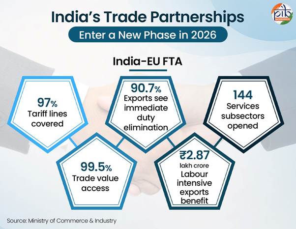 India’s trade partnerships in 2026 signal a decisive shift toward deeper global economic integration, supported by a broad network of modern and outcome-oriented trade agreements. Landmark agreement with the European Union, alongside other strengthened partnerships, are expanding market access, boosting exports, attracting investment, and creating new employment opportunities across sectors. Complemented by domestic policy, financial, and regulatory measures to strengthen exporter competitiveness, India’s trade ecosystem is becoming more resilient and globally integrated.