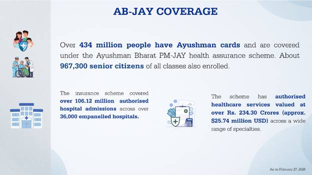 AB-PMJAY provides healthcare coverage up to Rs. 5 lakhs per year (~$5,000 USD) for secondary and tertiary care services and hospitalisation to enrolled socio-economically deprived families and to all senior citizens above 70 years, saving them from catastrophic medical bills. The scheme provides cashless treatment across empanelled government-funded and private hospitals. The scheme is aimed at the bottom 40% of the Indian population, covering 120 million people, with over 434 million Ayushman cards already made.