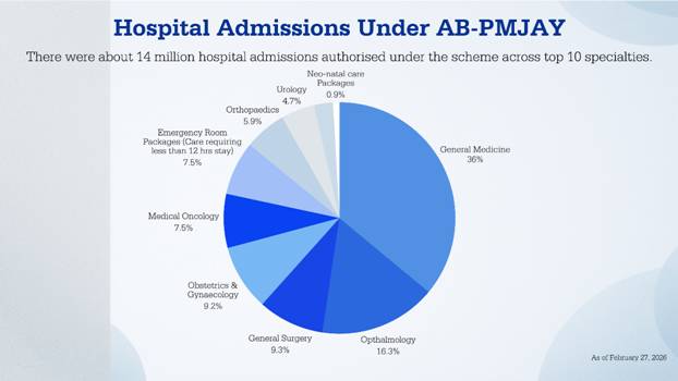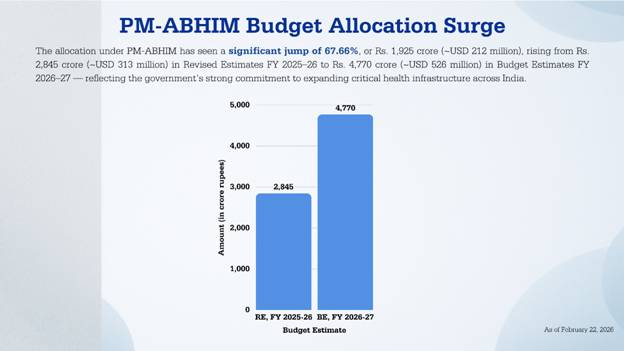 The allocation for the Pradhan Mantri Jan Arogya Yojana has been raised to Rs. 9,500 crore (~$1.05 billion USD) in Budget Estimates 2026–27, up by Rs. 500 crore (~$55 million USD) or 5.56% over the Revised Estimates of Financial Year 2025–26. This increase aims to expand beneficiary coverage, improve service quality, and strengthen hospital networks.