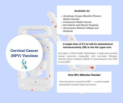 The Government of India launched a three-month nationwide HPV Vaccination Programme on February 28, 2026, for the prevention of cervical cancer among women. The Gardasil-4 vaccine, which is a single-dose, WHO pre-qualified vaccine used in immunisation programmes across the world, is now being given to adolescent girls aged 14 years, free of cost, at all government primary and community health centres, district and sub-district hospitals, and government medical colleges and hospitals across the country through central-state/UT government collaboration. Gardasil-4, a quadrivalent HPV vaccine protects against HPV types 16 and 18 (which cause cervical cancer), as well as types 6 and 11.