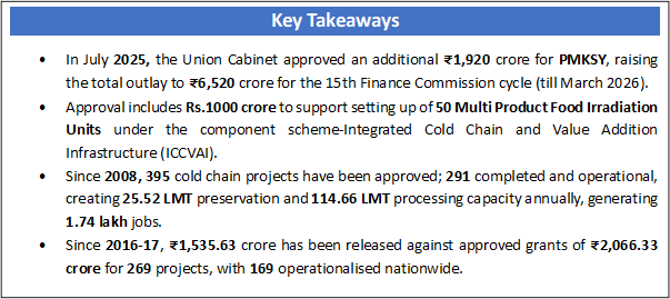 The Union Cabinet in July 2025 approved an additional outlay of1,920 crore for the PMKSY, raising the total allocation to 6,520 crore for the 15th Finance Commission cycle (up to March 31, 2026). This approval includes Rs. 1000 crore to support the setting up of 50 Multi-Product Food Irradiation Units under the component scheme-Integrated Cold Chain and Value Addition Infrastructure (ICCVAI). This significant increase reflects the government’s strong commitment to expand the impact of cold chain infrastructure.