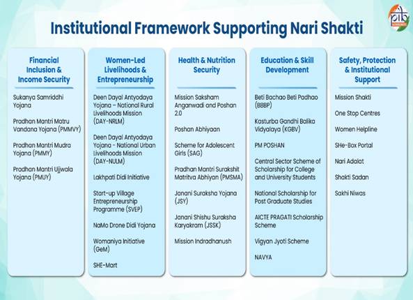 Skills and innovation ecosystems: Women are increasingly entering new-age sectors through expanded skilling and startup ecosystems. Nearly 45% of Pradhan Mantri Kaushal Vikas Yojana beneficiaries are women, while over 75,000 women-led startups have been supported under Start-Up India. Programmes such as NAVYA (2025) are further strengthening vocational training for adolescent girls in aspirational districts.