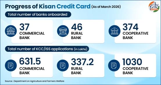 Under the Kisan Credit Card (KCC) platform, a total of 457 banks has been onboarded, including 37 commercial banks,46 regional rural banks, and 374 cooperative banks. It indicates a diversified delivery architecture to ensure broad geographic coverage and inclusive access to institutional credit for farmers nationwide. Across these institutions, a total of 1,998.7 lakh kisan credit card applications have been processed, of which 631.5 lakh were through commercial banks, 337.2 lakh through regional rural banks, and 1030.0 lakh through cooperative banks. It reflects the broad institutional participation in the KCC implementation and highlights the central role of cooperative banks in extending agricultural credit, particularly at the grassroots level.