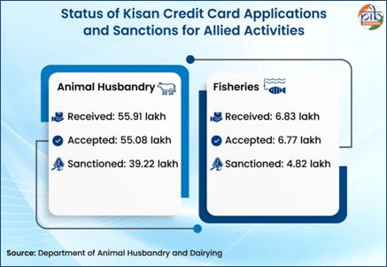 The facts and figures indicate a strong institutional response to credit demand in allied agricultural activities. In animal husbandry, the exceptionally high acceptance rate, 55.08 lakh out of 55.9 lakh applications, reflects broad eligibility, effective screening mechanisms, and sustained policy support for the sector. The sanctioning of 39.22 lakh applications further suggests substantial credit flow, translating into actual financial support.