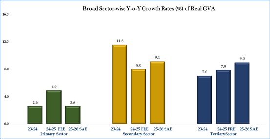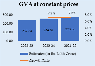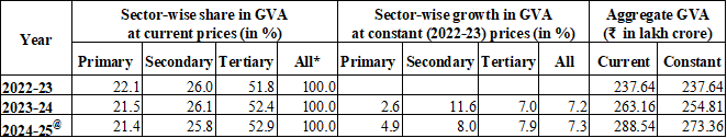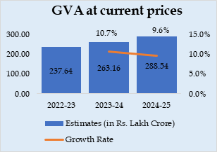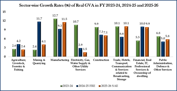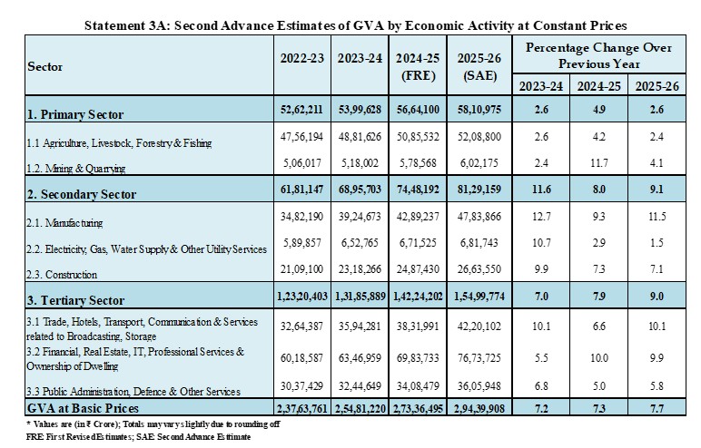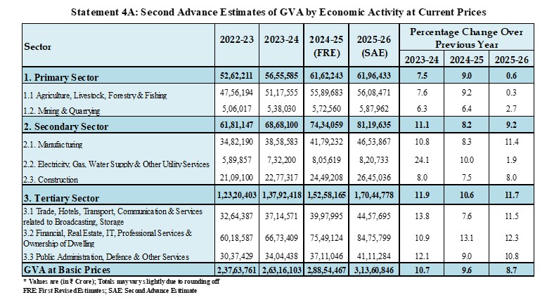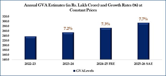 Real GVA is estimated at 294.40 lakh crore in the year 2025-26, against 273.36 lakh crore in FY 2024-25, registering a growth rate of 7.7% as compared to 7.3% growth rate in 2024-25. Nominal GVA is estimated to attain a level of 313.61 lakh crore during FY 2025-26, against ₹288.54 lakh crore in 2024-25, showing a growth rate of 8.7%.