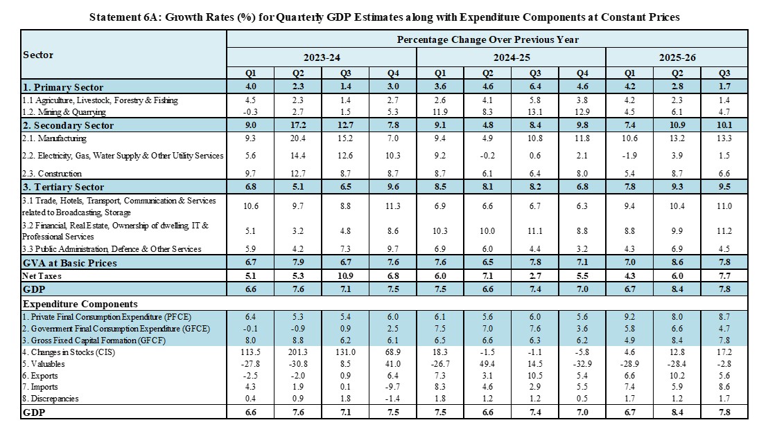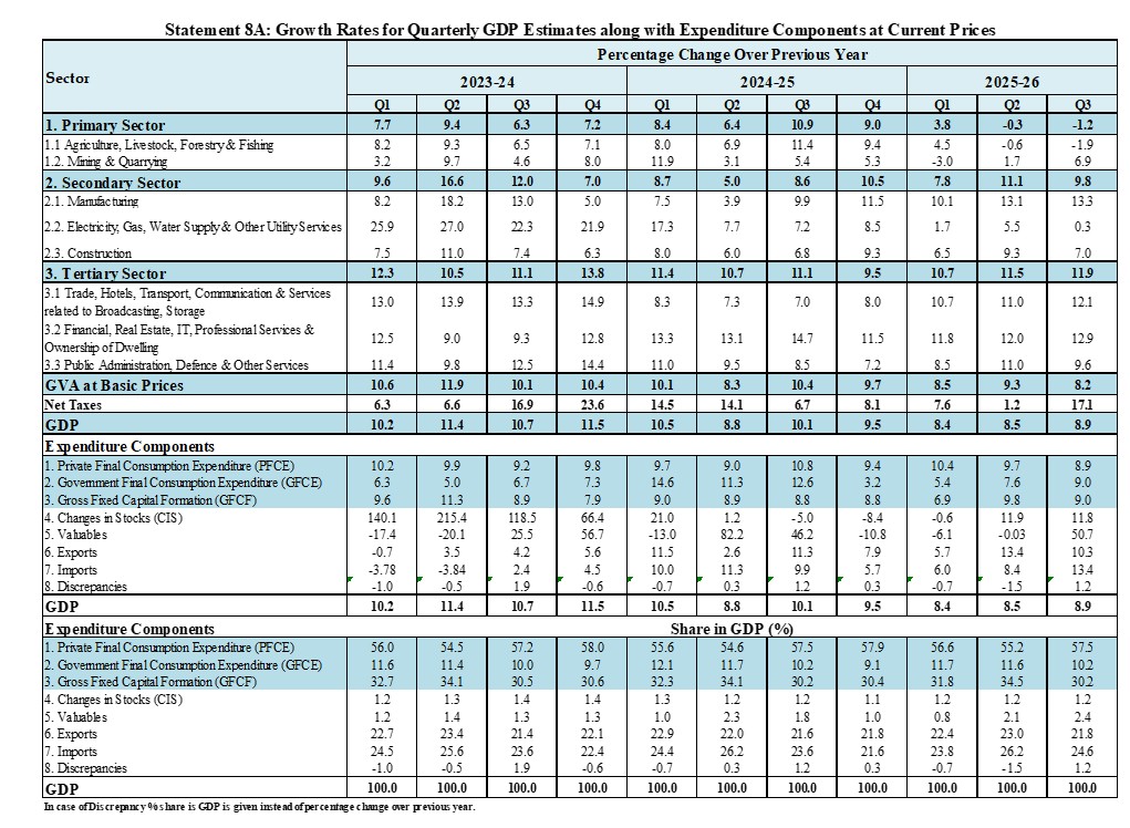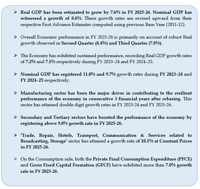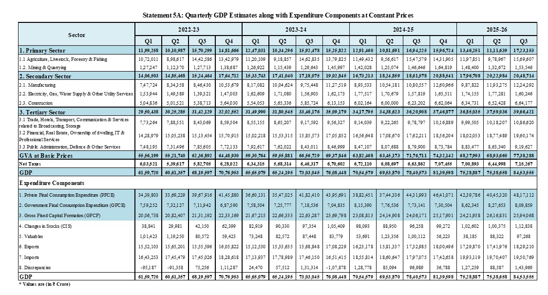 Apart from the rebased Quarterly GDP estimates, this part of the press note majorly includes the Second Advance Estimates (SAE) of Annual GDP for the Financial Year (FY) 2025-26 and Quarterly Estimates of GDP for Q3 (October-December) of FY 2025-26. Detailed structure of Part A of the press note is as follows.