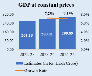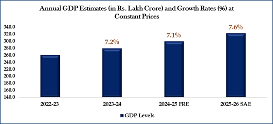 Real GDP or GDP at Constant Prices is estimated to attain a level of 322.58 lakh crore in the FY 2025-26, against the First Revised Estimate (FRE) of GDP for the year 2024-25 of 299.89 lakh crore. The growth rate in Real GDP during 2025-26 is estimated at 7.6% as compared to 7.1 % in 2024-25. Nominal GDP or GDP at Current Prices is estimated to attain a level of 345.47 lakh crore in the year 2025-26, against 318.07 lakh crore in 2024-25, showing a growth rate of 8.6%.