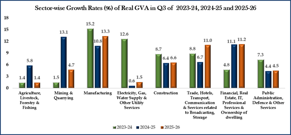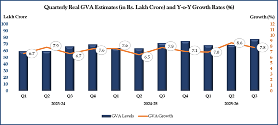 Real GVA in Q3 of FY 2025-26 is estimated at 77.38 lakh crore, against 71.77 lakh crore in Q3 of FY 2024-25, showing a growth rate of 7.8%. Nominal GVA in Q3 of FY 2025-26 is estimated at 82.58 lakh crore, against 76.35 lakh crore in Q3 of FY 2024-25, showing a growth rate of 8.2%.