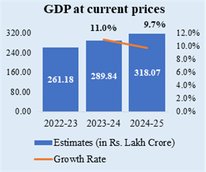 Gross National Disposable Income (GNDI) at current prices is estimated at ₹324.52 lakh crore for the year 2024-25, while the estimate for the year 2023-24 stands at ₹294.55 lakh crore, showing a growth of 10.2 % for year 2024-25 as compared to growth of 10.9 % in the year 2023-24.