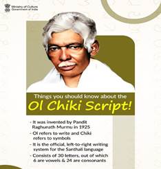 The Ministry of Culture, in collaboration with Fagun (a monthly Santhali newspaper), is organising the Inaugural Function of the Centenary Celebrations of the Ol Chiki Script, created by Pandit Raghunath Murmu, on 16th February 2026 at Dr Ambedkar International Centre, New Delhi.