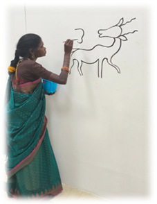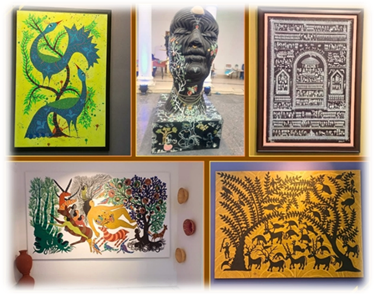 Text Box: Tribal Art in India includes a wide range of forms such as paintings, metal crafts, wood carvings, textiles, pottery, and body art, many of which originate in rural and forested regions where tribal communities live. Common themes include nature, animals, mythology, ancestral spirits, agricultural life, and community celebrations. These artworks are often created using locally available materials such as natural pigments, bamboo, wood, clay, and metal.