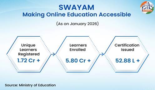 SWAYAM, launched in collaboration with IIT Madras, is a flagship national initiative envisaged to provide learners free access to high-quality educational content in alignment with the vision of “Anyone, Anywhere, Anytime Learning.” The platform offers a diverse range of courses across multiple disciplines, curated by premier institutions to support holistic and well-rounded learning. As of January 2026, over 4,400 unique courses have been developed on SWAYAM by ten National Coordinators, namely NPTEL, UGC, AICTE, CEC, IGNOU, IIMB, NITTTR, INI, NCERT, and NIOS. Since its inception, SWAYAM MOOCs have witnessed cumulative enrolments of approximately 5.80 crore learners, with 52.88 lakh certifications awarded.