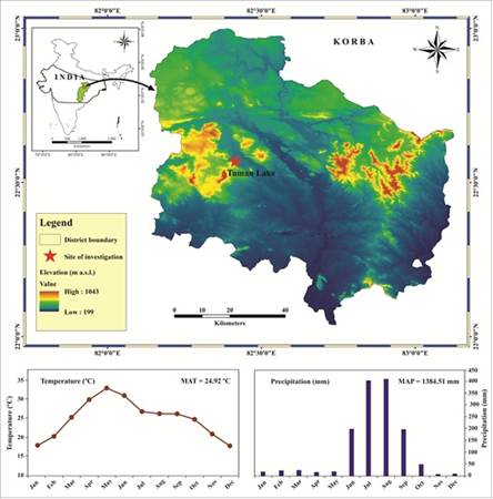 Fig. 1. Shuttle Radar Topographic Mission (SRTM) Digital Elevation Model (DEM) of the Korba District, Chhattisgarh State, central India, showing the location of the study area (the red star shows the site of investigation). Geographic map of India showing Korba District in Chhattisgarh State, and the Core Monsoon Zone (CMZ) of India (dark black and bold lines) (left upper panel).  This figure was created using ArcGIS 10.8.2. Nearest Climate research Unit Time Series (CRU TS) 4.07, 0.5 × 0.5 gridded climate data point, 1901–2022, showing mean monthly precipitation and temperature around the study area (inserted down panel). MAP = Mean Annual Precipitation; MAT = Mean Annual Temperature.