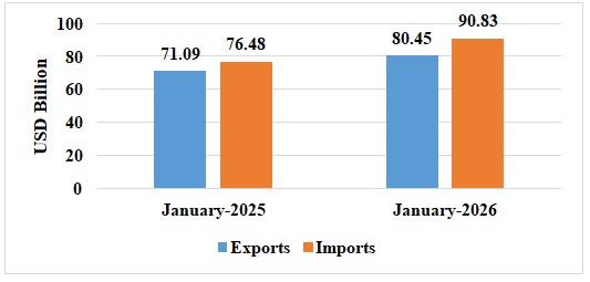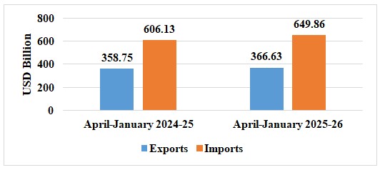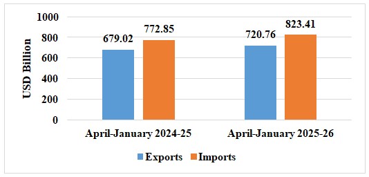 The cumulative exports (merchandise & services) during April-January 2025-26 is estimated at US$ 720.76 Billion, as compared to US$ 679.02 Billion in April-January 2024-25, an estimated growth of 6.15%