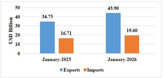 The cumulative exports (merchandise & services) during April-January 2025-26 is estimated at US$ 720.76 Billion, as compared to US$ 679.02 Billion in April-January 2024-25, an estimated growth of 6.15%